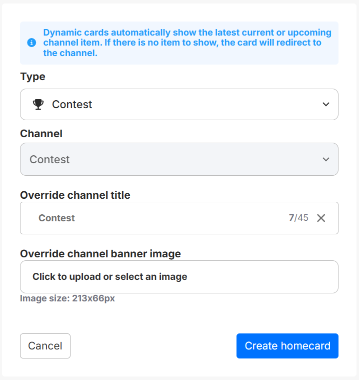 Dynamic Homecards automatically retrieve the latest available content from the selected channel (for example, the latest contest). If no content is available, the card redirects directly to the channel itself.