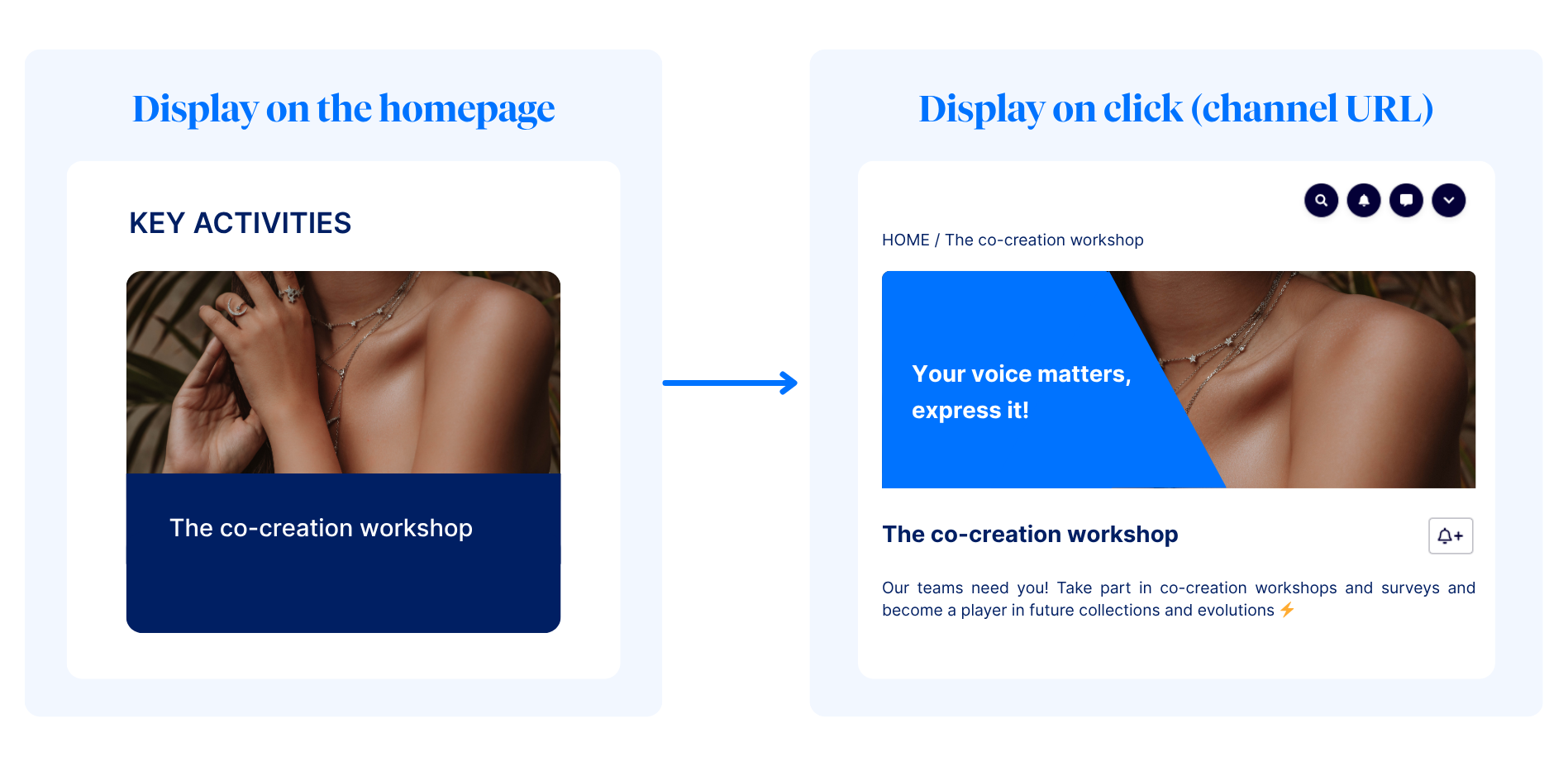 It is possible to highlight product testing campaigns, contests, surveys and events. This type of card is ideal for automation and for highlighting live community activities.