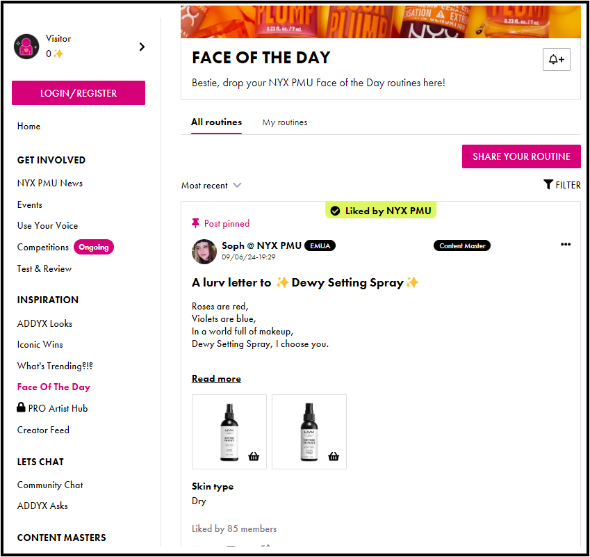 Routine Channel: Members can describe their personal routines (e.g., skincare), tag products from the brand’s catalog, and share experiences or tips with others.
