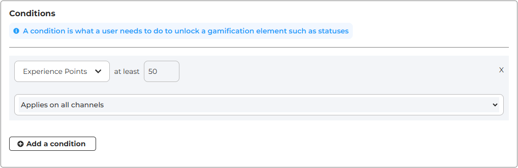 In the "Conditions" section, you can choose one or more conditions that the user must meet to receive this status. The selection is very diverse, allowing you to create statuses tailored to your needs.