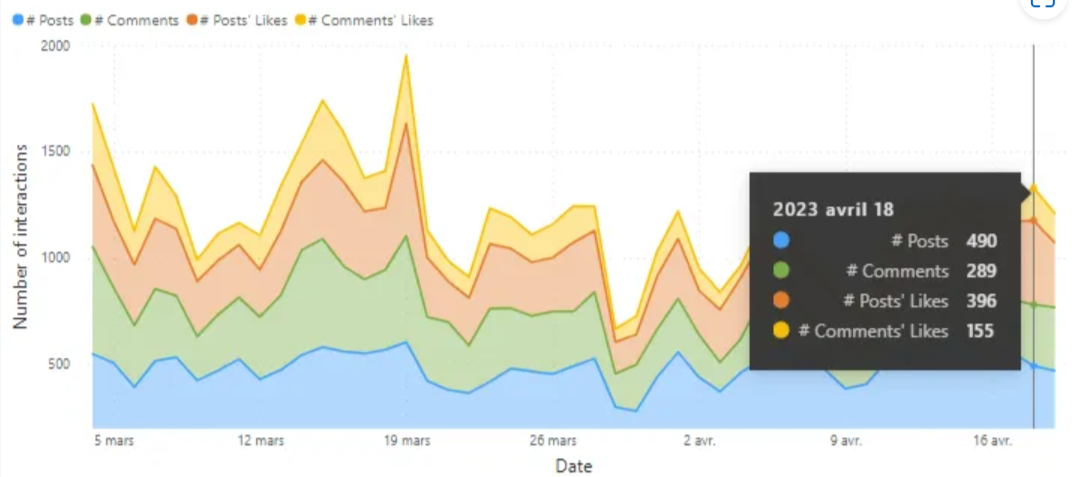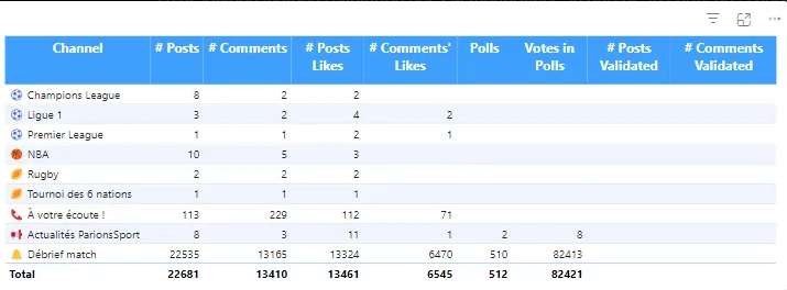 The table on the right gives details of the 1000 most visible posts with the most interactions (comments + likes + number of votes on the poll in the post = score) over the period and for the selected channel(s).