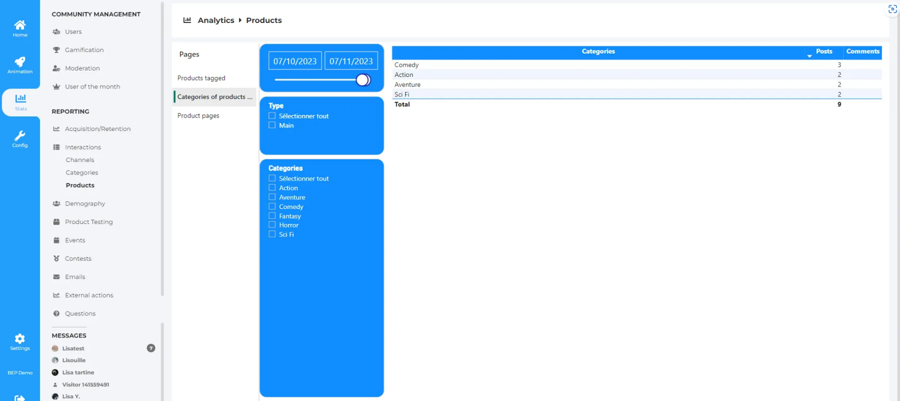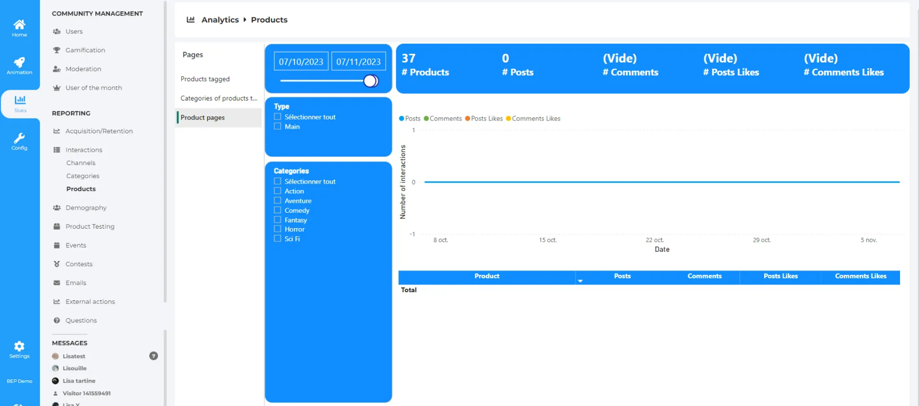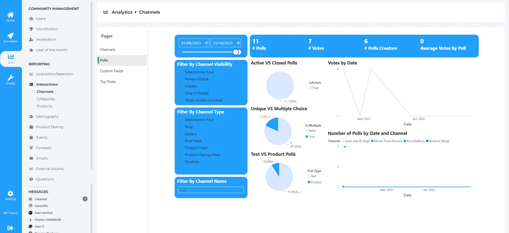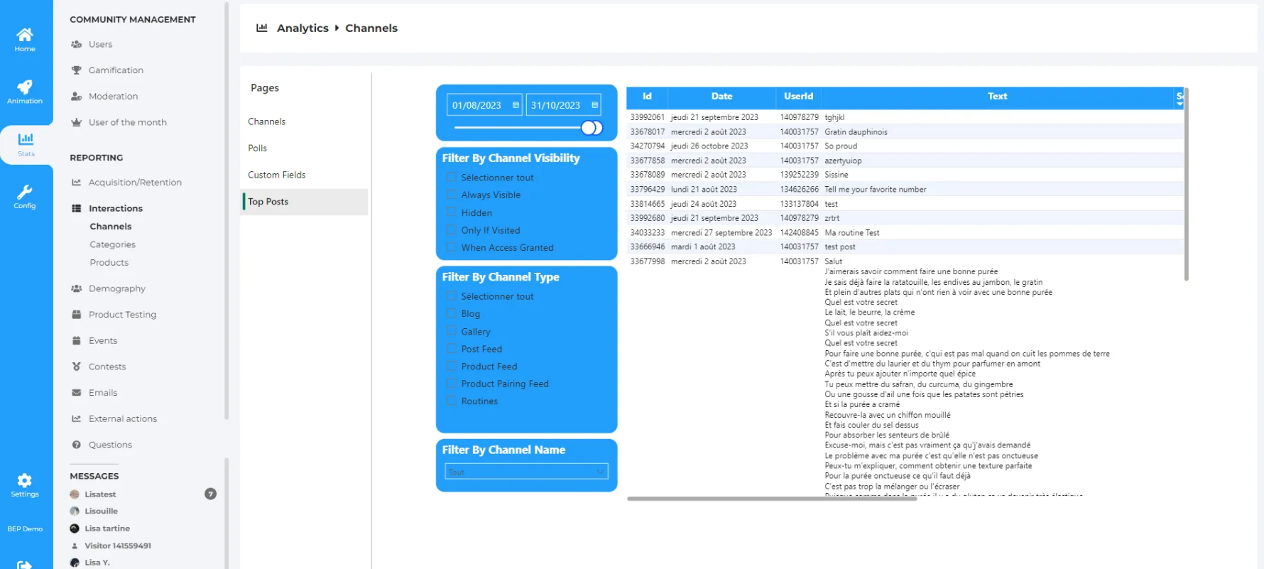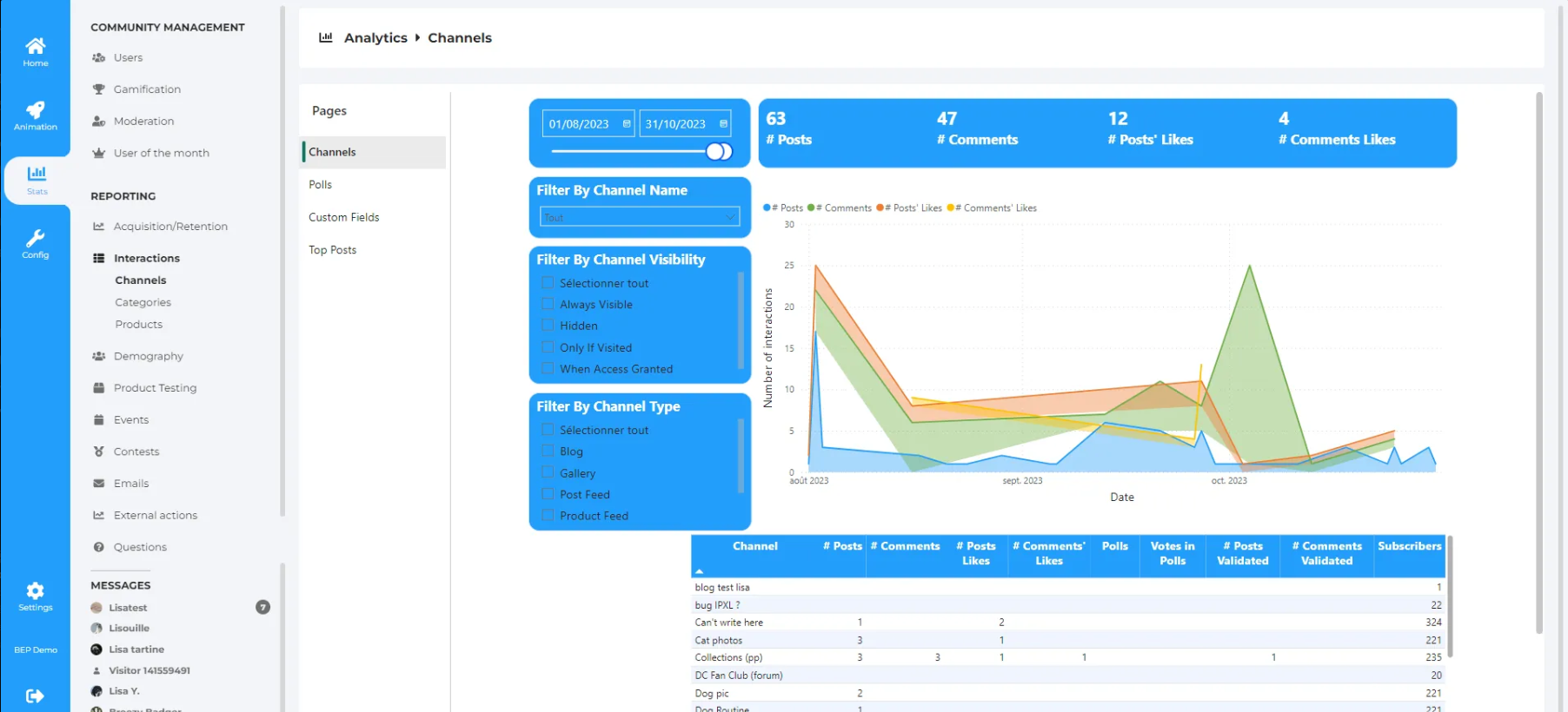 This section allows you to track, analyze, and export data related to interactions within the community, particularly those on the channels (channels, polls, custom fields, popular posts), categories, and products (tagged products, tagged product categories, product pages).