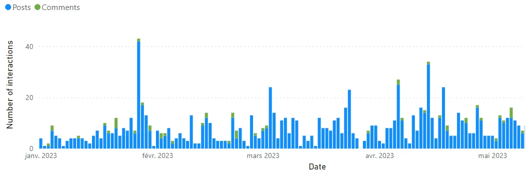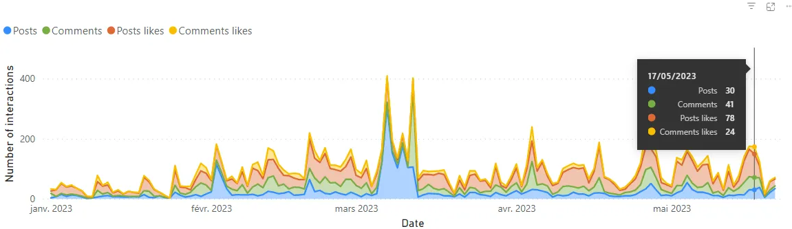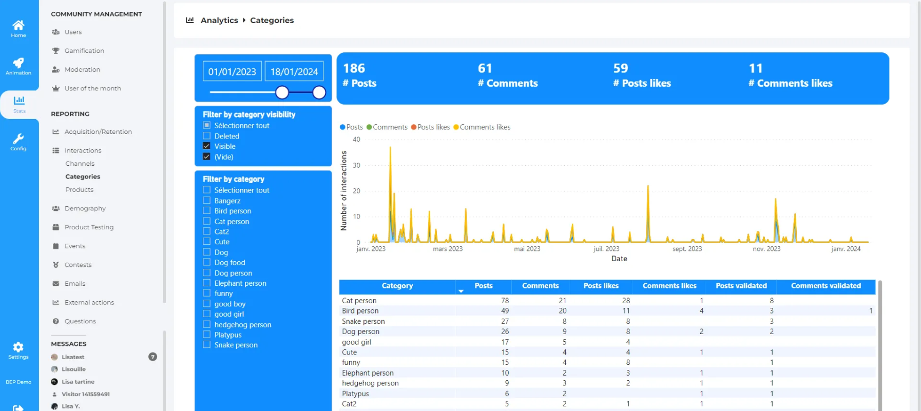 This section presents KPIs on posts, comments, and likes by category, a graph showing their evolution over the selected period, and a table detailing these data by category and channel, with sorting and export options.