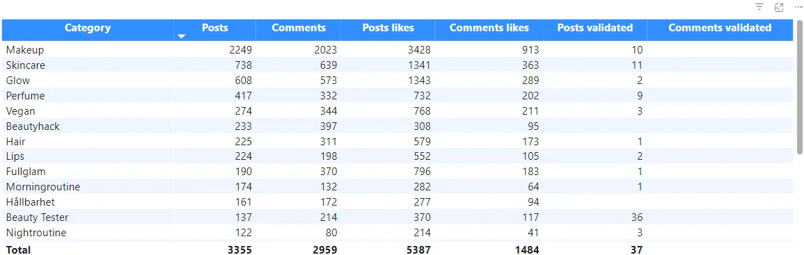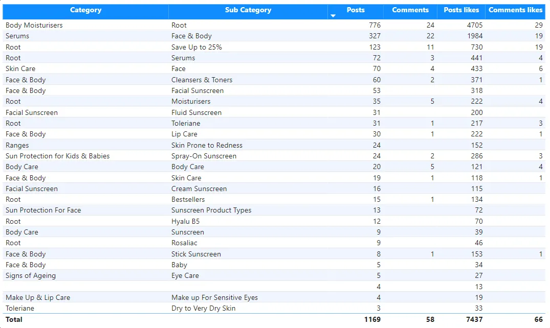 The table provides the details per category/subcategory combination of the number of posts and comments where it was tagged, along with the number of likes on those posts and comments.