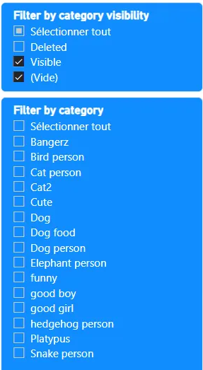 - Filter categories by status (deleted or not) and/or by Name (These 2 filters are interdependent, if you choose Visible categories, you can only filter by name for non-deleted categories.