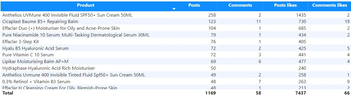 The table provides the details per product of the number of posts and comments where it was tagged, along with the number of likes on those posts and comments.
