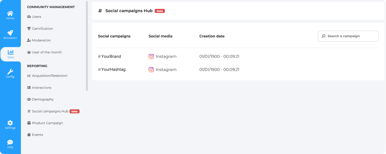 The Social Campaign Hub is a dashboard that centralizes all your social campaign data and community-generated content on socials in one place.