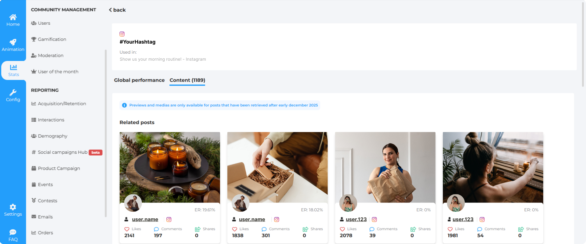 This dashboard provides clear visibility into ROI and improves operational efficiency by helping you track and analyze results, export and reuse user-generated content (UGC) and optimize future campaigns, directly from the back-office.