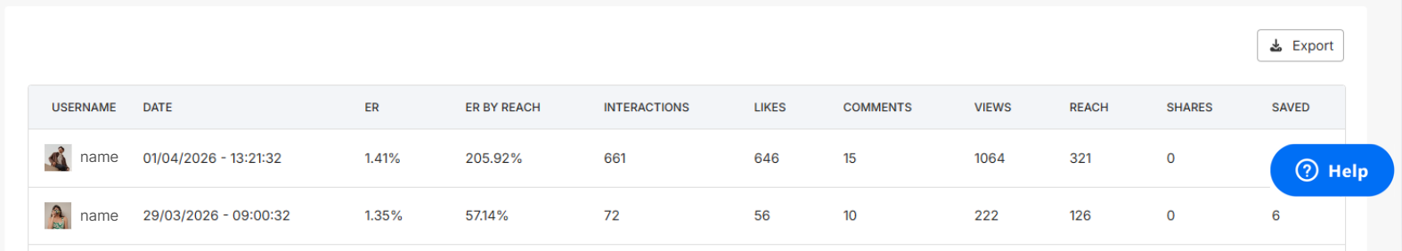 - Engagement data: engagement rate, likes, comments, shares