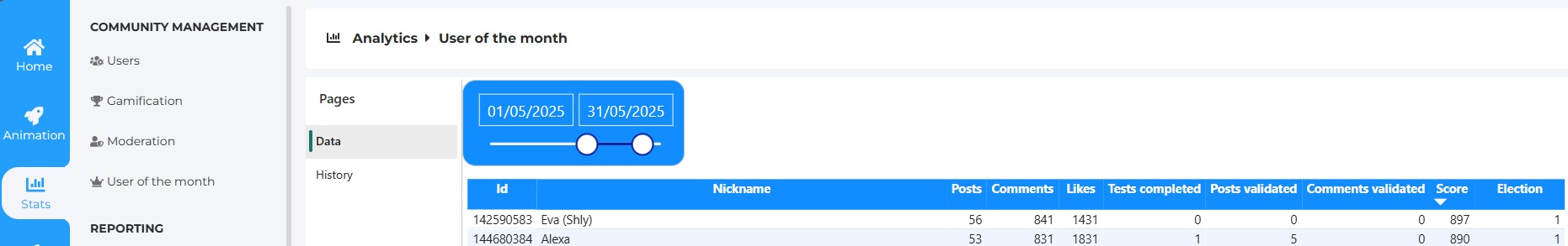 - Score: total of the user's posts, comments, survey answers, poll responses, product test applications, completed product tests, validated posts, and validated comments
