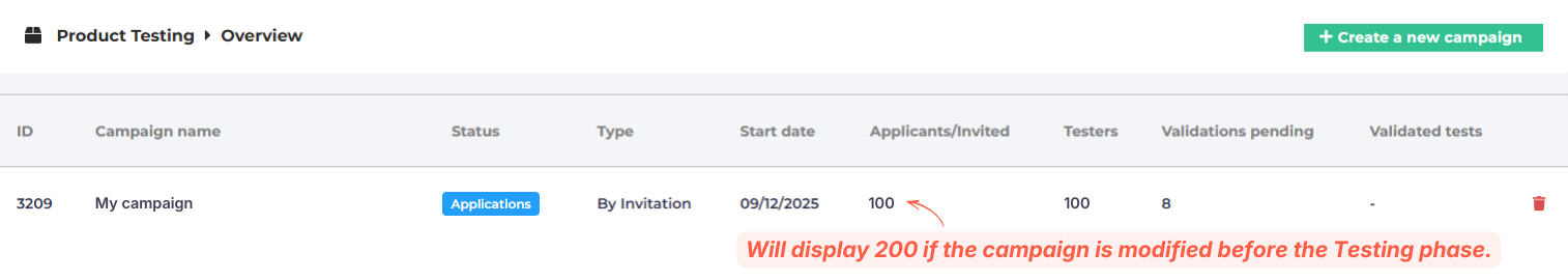 If an invitation-only campaign is modified before the final selection of testers, the invitation email will be sent again. This doubles the number shown in the Applicants/Invited column and may create confusion. Don’t worry, the number of testers remains the one you initially selected.