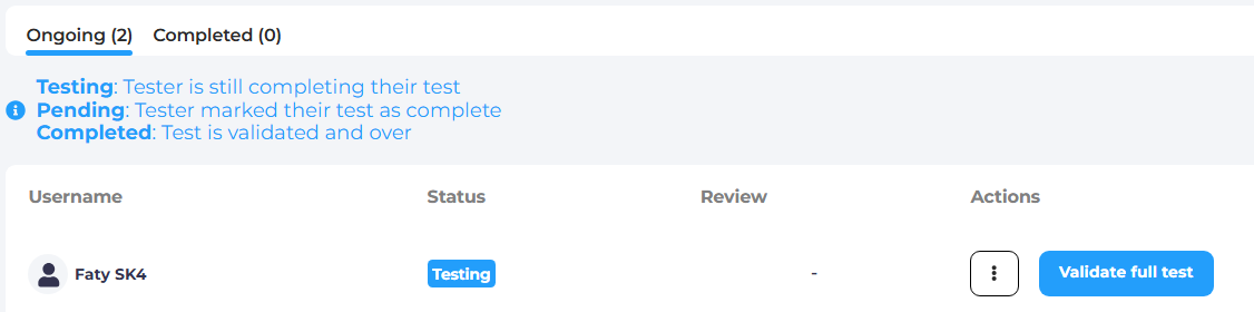 - A "Validate full test" button allows you to indicate that the tester has completed the test → this unlocks the associated rewards and changes the tester’s status to Validated.