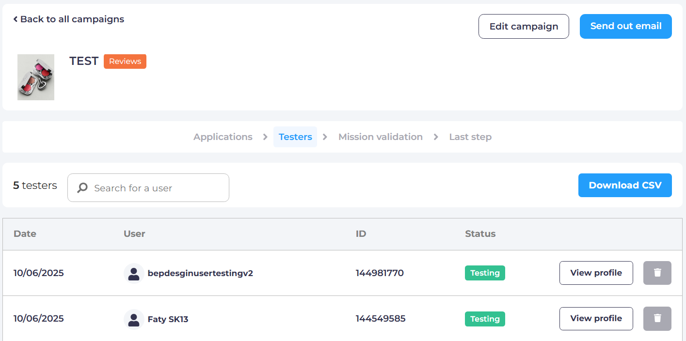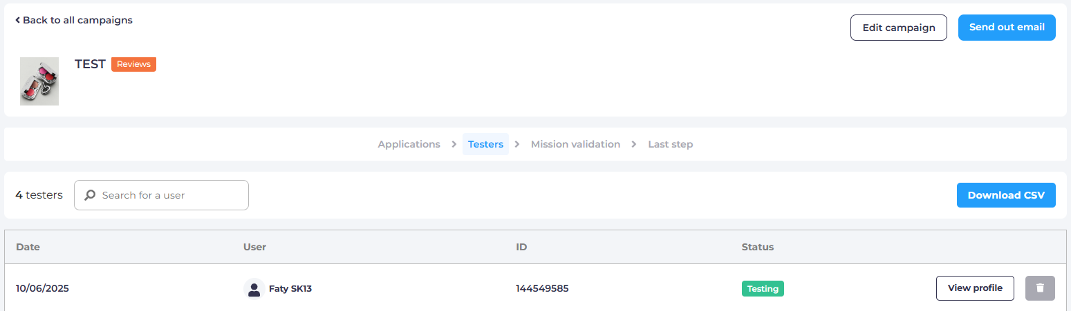 - Click on "End campaign": Available at any time (even if you have not selected testers yet or if you have not received all reviews). Neither applicants nor testers are notified of this action.