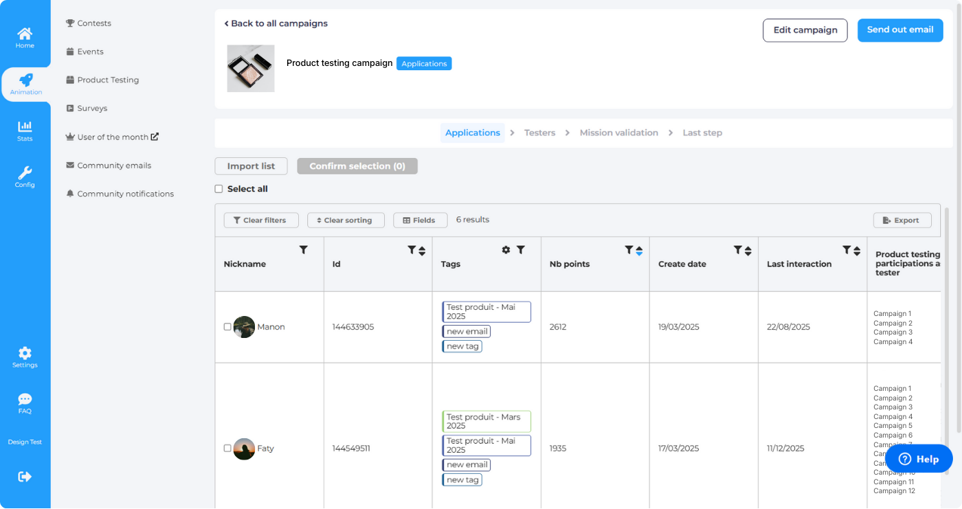 - If you created an open campaign, you can validate applicants by selecting them one by one directly from the back office. Alternatively, you can export the applicant list, sort it in Excel, then import the file to select them. to learn more about testers selection, check out this article.