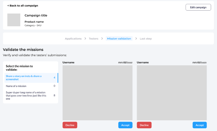 If you have configured one or more missions with screenshot validation (requiring your manual approval to be completed), you can validate the screenshots submitted by testers directly from the campaign tracking, in the "Mission validation" tab.
