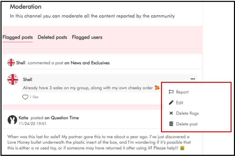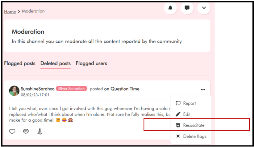 👉Pour modérer un post dans la chaîne de modération, clique sur les trois points en haut à droite du post et choisis l'action que tu cherches.