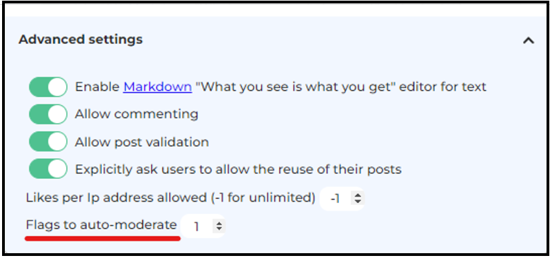 Signalements pour modération automatique : Cette règle peut être modifiée dans chaque communauté et dans chaque groupe (chaînes > éditer > configuration des posts > paramètres avancés > signalements pour auto-modération).