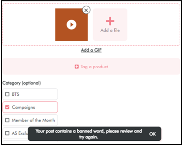 Si un membre partage une publication ou un commentaire contenant un mot interdit, il verra une fenêtre pop-up lui demandant de modifier son post.