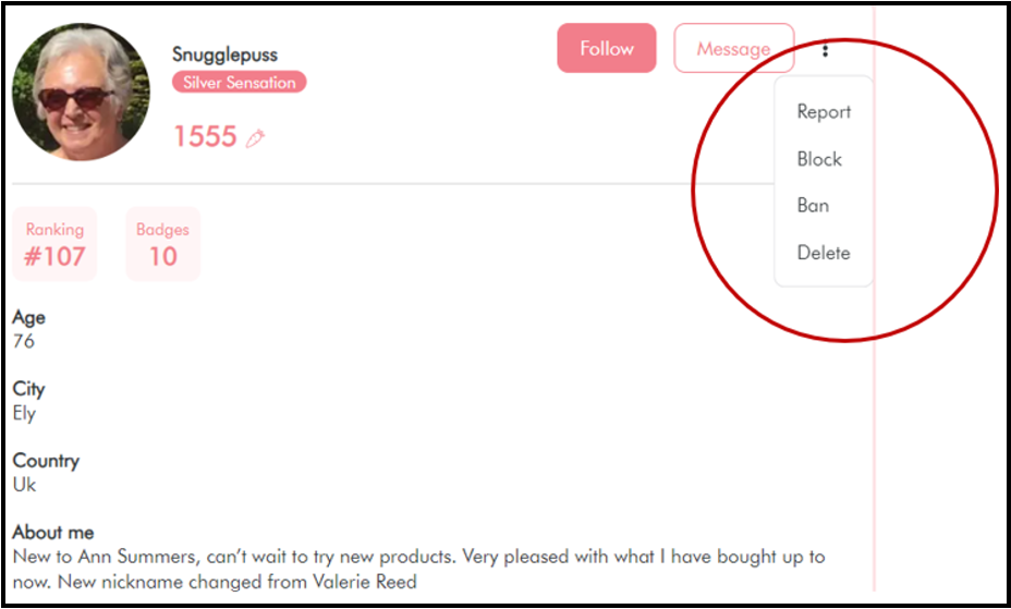 Pour bloquer un utilisateur, bannir ou supprimer son profil… va sur son profil public, clique sur les trois points en haut à droite, et choisis l'action que tu cherches.
