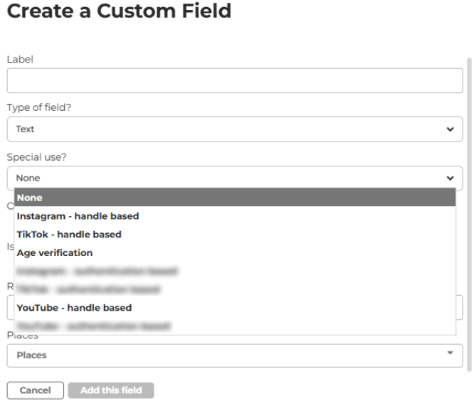 👉 Pour les champs texte, les utilisateurs peuvent ajouter leur pseudo TikTok, Youtube ou Instagram à leur post. Pour cette option, un seul champ personnalisé avec l’usage spécial "TikTok" est autorisé.