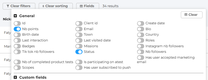 Juste au dessus du tableau des utilisateurs, clique sur le bouton "Fields" pour accéder aux filtres.