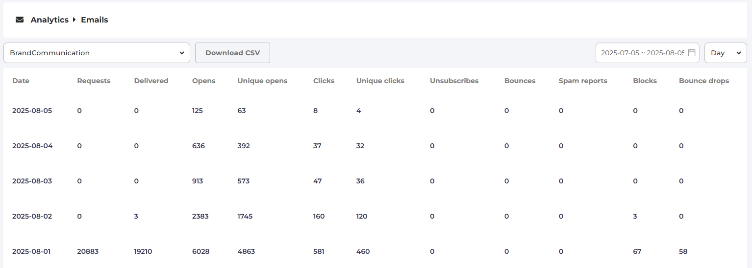 Il s’agit des e-mails BrandCommunication que tu crées et envoies selon ton choix. Tu peux définir tes segments de destinataires grâce aux filtres pour une communication ciblée.