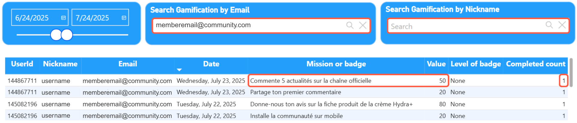 Dans Stats > Gamification > User detail, cherche le membre à l'aide de son adresse e-mail ou son pseudo. Tu pourras alors vérifier si pour la mission concernée, le membre a déjà reçu les points ou non.