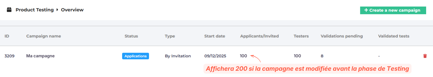 Si une campagne sur invitation est modifiée avant la sélection finale des testeurs, l'e-mail d'invitation sera renvoyé. Cela double alors le nombre dans la colonne Applicants/Invited et peut créer une confusion. Pas d'inquiétude, le nombre de testeurs reste bien celui que tu as choisi au départ.