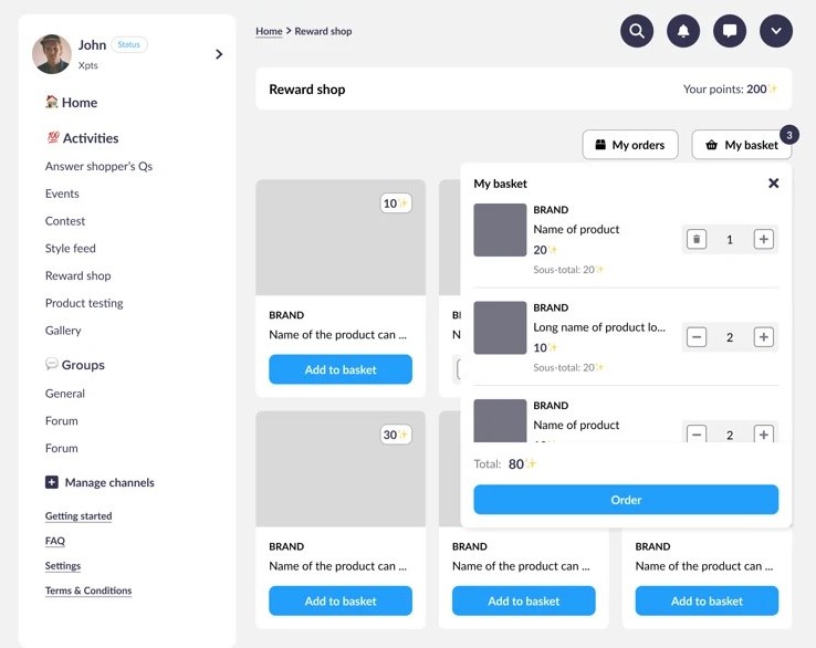 Le Reward Shop permet aux membres de choisir leurs récompenses grâce aux points gagnés dans la communauté. Tu crées un catalogue de produits dédié, les membres le parcourent, sélectionnent et commandent en toute autonomie.